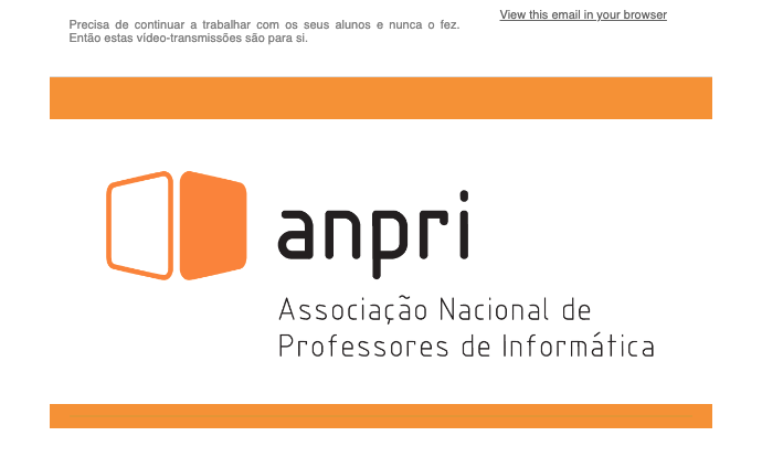 ANPRI – Associação Nacional de Professores de InformáticaA Equipa de Formadores da ANPRI vai dinamizar vídeo-transmissões, em direto, via Youtube para apoiar os professores que pretendam iniciar o seu trabalho com alunos online.Estas vídeo-transmissões realizam-se dia 17, 18, 19 e 20 de março de 2020, pelas 17 horas.Clique aqui para ler mais ANPRI